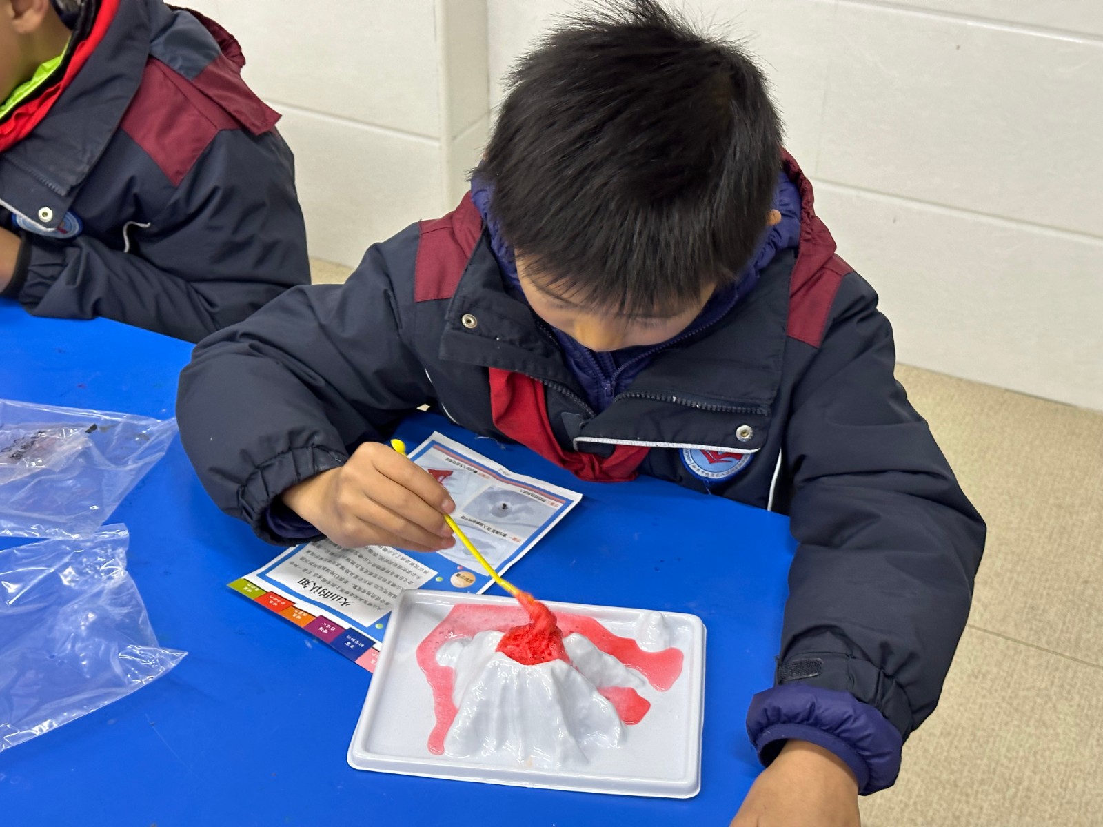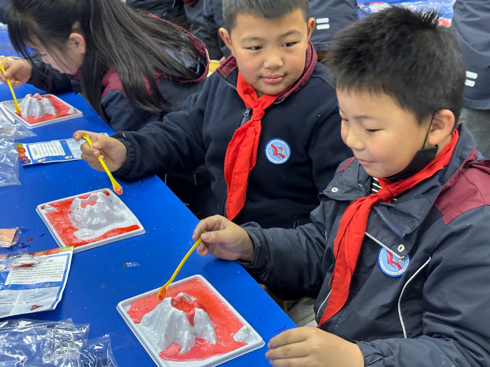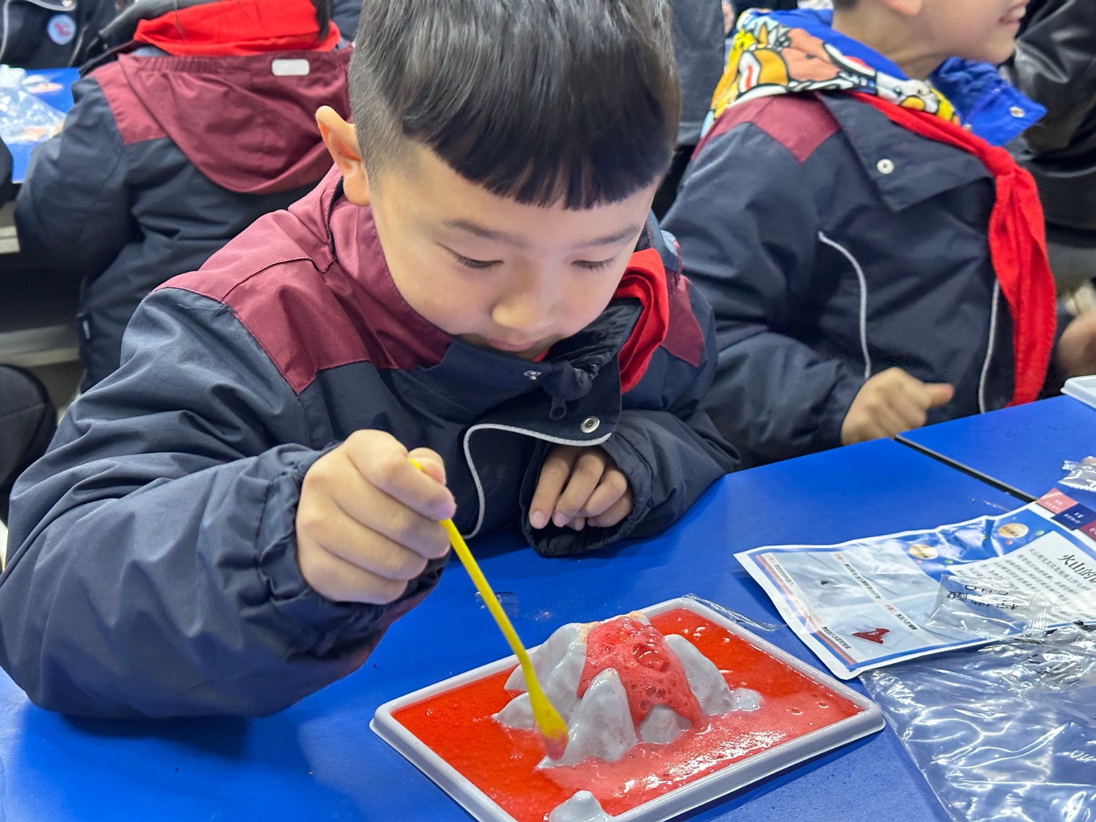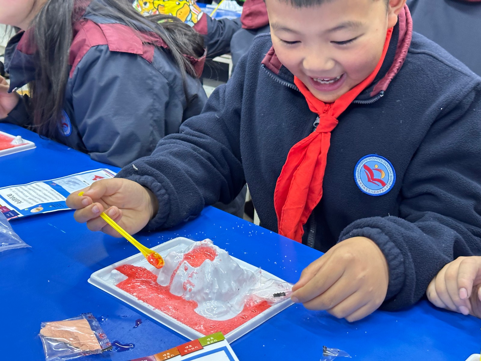 当看到实验材料产生化学反应冒出红色泡泡并喷涌而出时,参与活动的学生们都发出了“好厉害”的惊叹声。周老师趁机又向孩子们科普了产生此次化学反应的原理,并用常见的碳酸饮料举例,解释了这次实验“火山喷发”的原因,让大家更加生动形象了解了这次的实验活动。