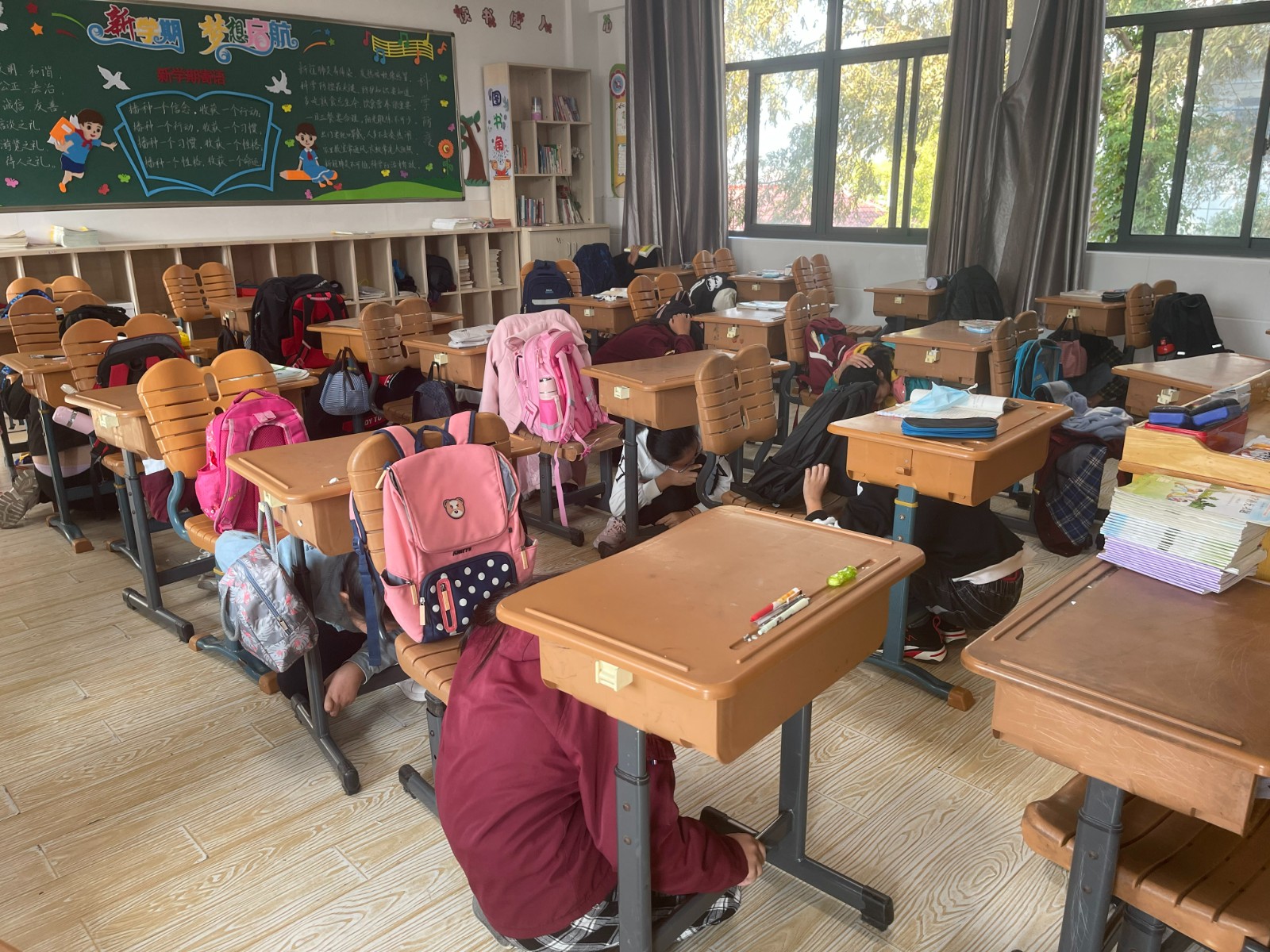 随着"注意,地震,请就地避震",广播响起口令,学生迅速蹲下,躲在课桌旁,并用书包或书本保护头部。