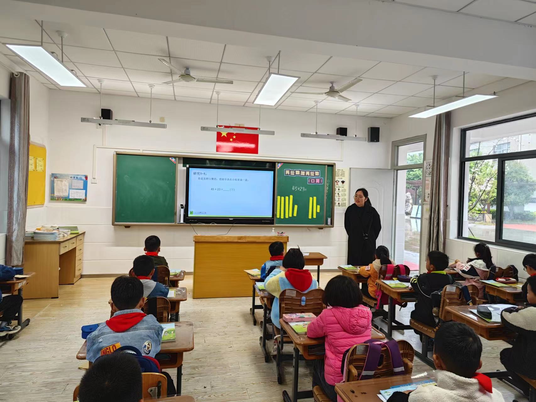 周校长和数学老师们齐聚二(1)班,大家一起聚精会神地聆听着由葛晶老师带来的一节精彩的数学课《两位数加两位数(口算)》。